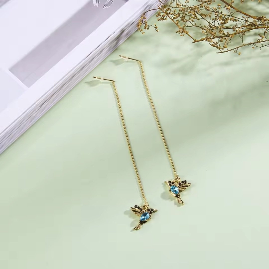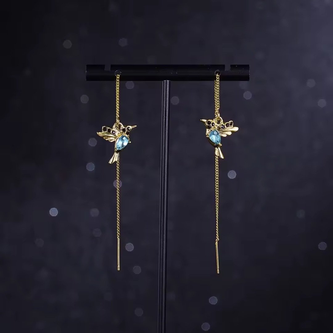 Ciepły, złoty połysk łańcuszka i zawieszek dopełniają błękitne, łezkowe oczko w korpusie oraz drobne czarne kryształki na głowie.