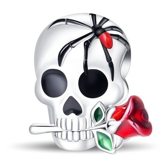 Zawieszka charms typu Pandora Czaszka z Różą i Pająkiem przedstawia srebrną czaszkę z czarnym pająkiem na czole i czerwoną różą trzymaną w zębach.