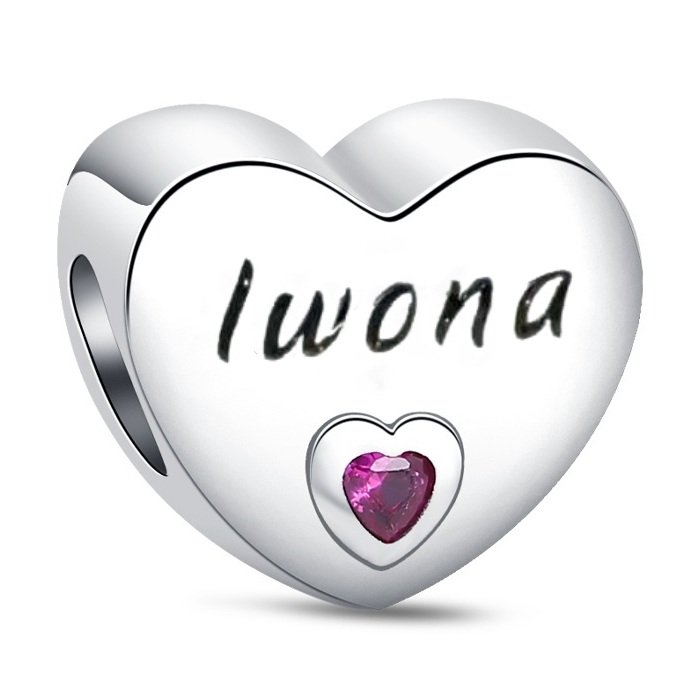 Zawieszka charms typu Pandora Serce z Imieniem Iwona przedstawia gładkie srebrne serce z odręcznym napisem i małym kamieniem w kształcie serduszka.