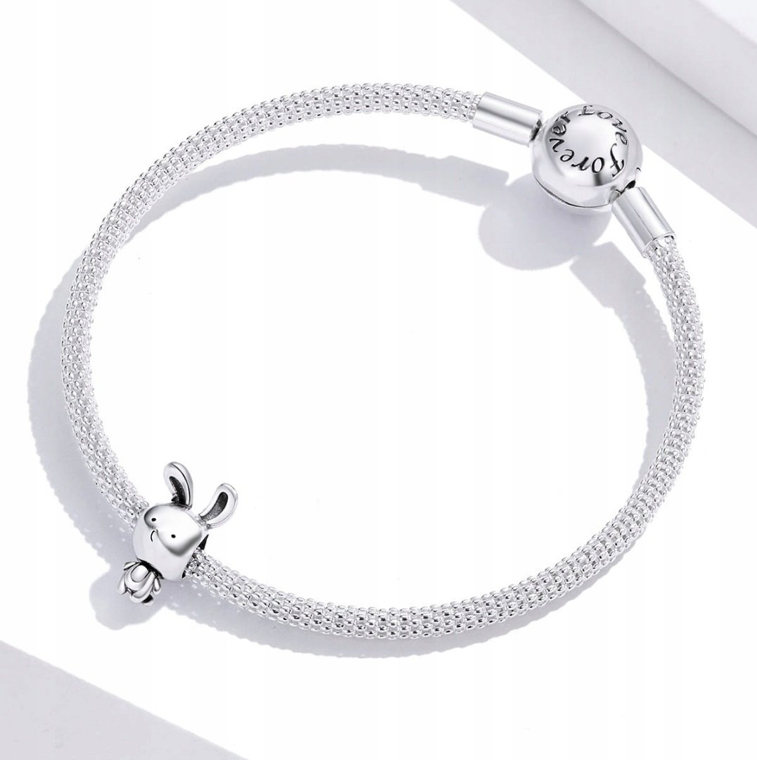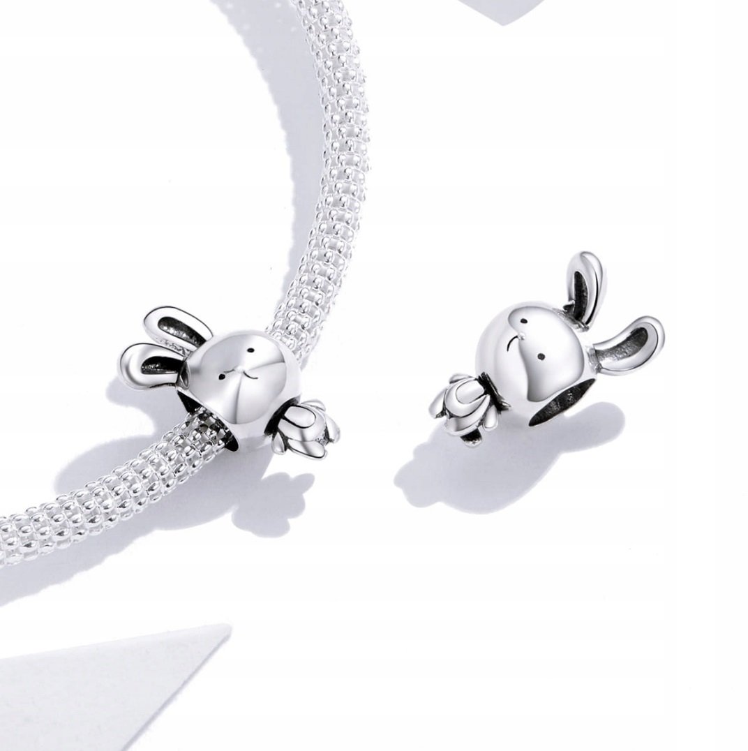 Zawieszka charms typu Pandora Królik to uroczy dodatek wykonany ze srebra próby 925, przedstawiający postać zwierzątka z dużą głową i wyraźnie zaznaczonymi uszami. Całość utrzymana jest w połyskującej, srebrzystej tonacji z czarnymi akcentami podkreślającymi oczy, nosek i kontury. Długie uszy, sympatyczny pyszczek oraz małe łapki nadają zawieszce pogodny i radosny charakter. Symbolika królika wiąże się z łagodnością, pokojem oraz nowym początkiem. Dzięki uniwersalnemu designowi doskonale komponuje się z bransoletkami w stylu zwierzęcym i tematycznym. Ten charms to subtelny sposób na wyrażenie ciepłych emocji i optymistycznego podejścia do życia.