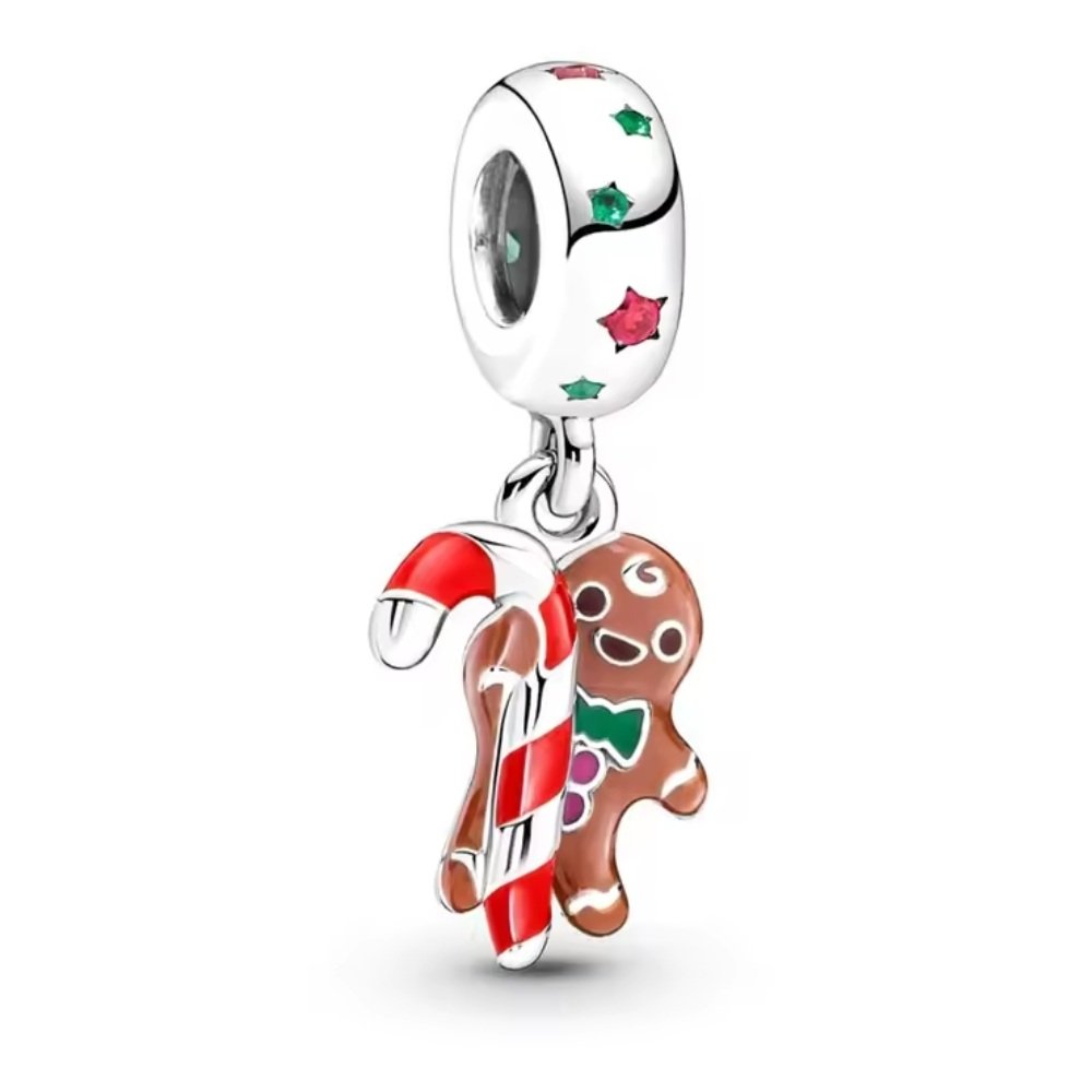 Zawieszka charms typu Pandora Piernik i Laska Cukrowa przedstawia świąteczny duet: brązowego ludka piernikowego i biało-czerwoną laskę w szkliwionej emalii.