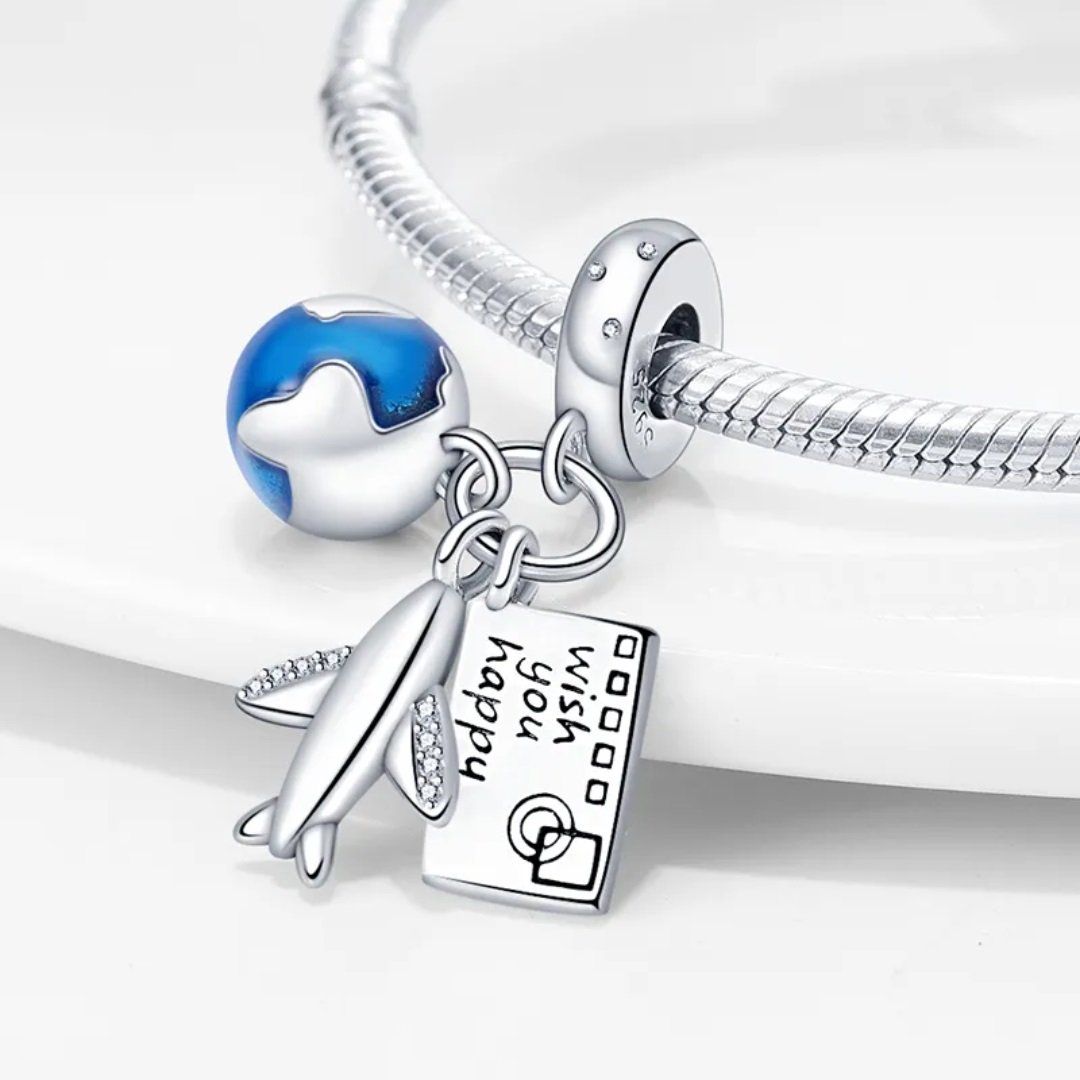 Zawieszka charms typu Pandora Samolot, Planeta i Pocztówka z Napisem to urokliwa kompozycja podróżniczych symboli zaklęta w srebrze próby 925. Trzy zawieszki przedstawiają: niebiesko-białą kulę ziemską z efektem połysku, samolot ozdobiony drobnymi cyrkoniami oraz pocztówkę z napisem „wish you happy”. Intensywny granat planety kontrastuje z jasnym srebrem, przyciągając wzrok i nadając głębi całemu projektowi. Charm nawiązuje do wolności, odkrywania świata i radości płynącej z podróży. Delikatne zdobienia oraz dynamiczna forma samolotu symbolizują ruch i marzenia o dalekich miejscach. To doskonały dodatek dla miłośników przygód, lotów i wspomnień zamkniętych w biżuterii.