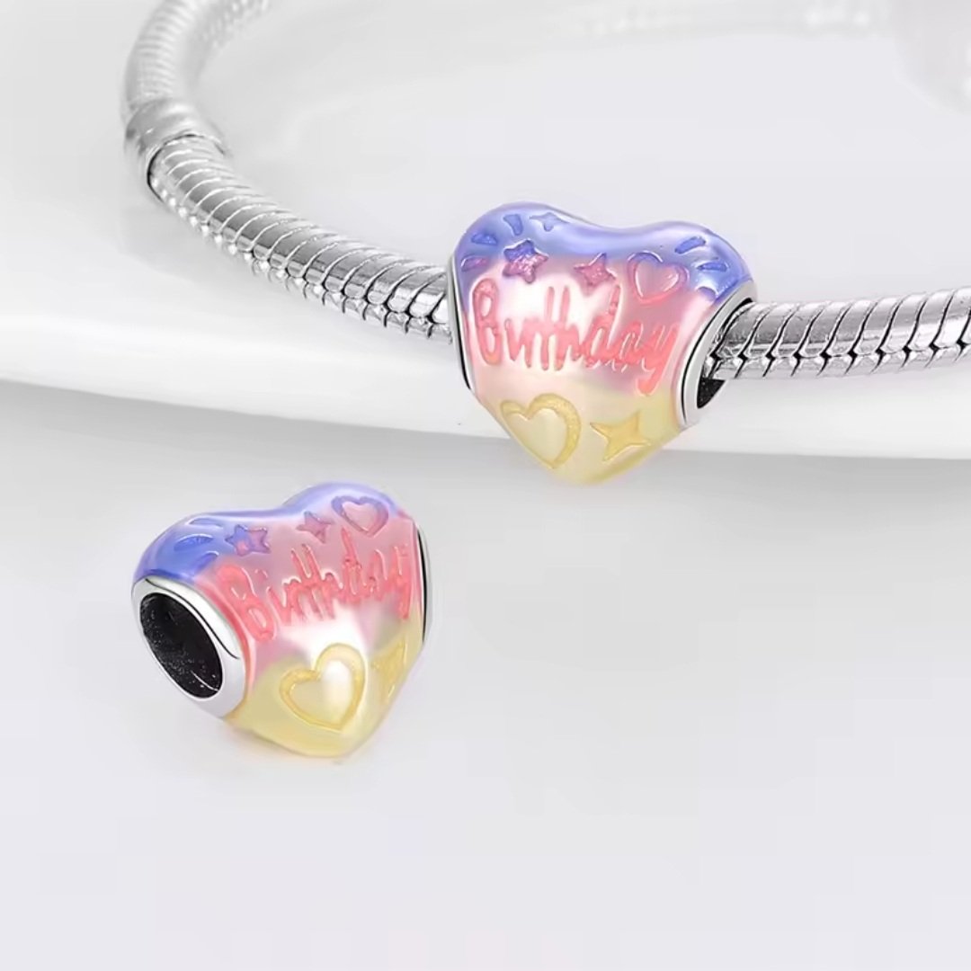 Zawieszka charms typu Pandora Serce na Urodziny przedstawia wypukłe serce z napisem „Birthday” oraz drobnymi motywami gwiazdek i serc.