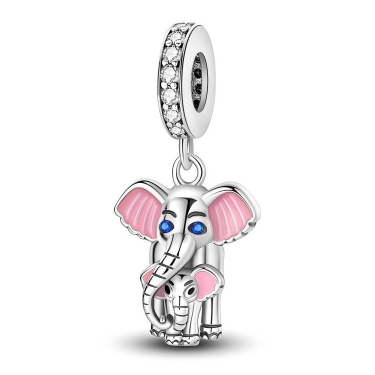Zawieszka charms typu Pandora Słoń Mama i Dziecko przedstawia srebrną mamę słonia z małym słonikiem na wiszącej przekładce.